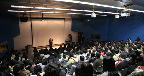 会谈后,特伦布莱市长在我校建筑城规学院钟庭报告厅作了题为'蒙特利尔--知识城市'的演讲,他用风趣幽默的语言鼓励在校大学生努力学习专业知识,关注社会发展,今后使自己成为知识的载体,服务于社会。他的演讲受到我校建筑城规学院学生的热情欢迎。 随同市长来访的康考迪大学(Concordia University)城规学院教授John Zacharias和校长办公室主任Clarence Epstein 博士,也分别作了题为'城市发展的前景'和'城市与大学的关系'的报告。