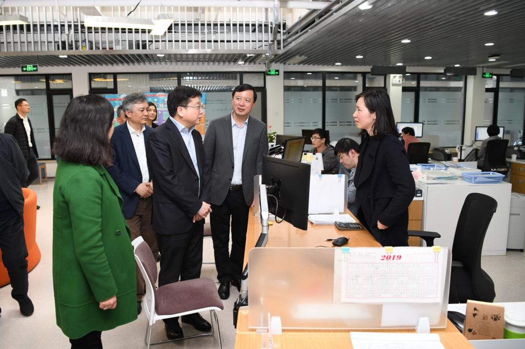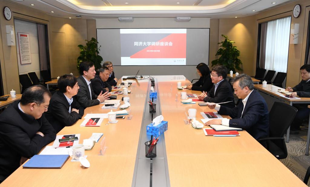 在参观活动结束后,调研座谈会举行。会上,陈杰汇报了我校2018年亮点工作及2019年重点工作。在过去的一年里,学校以党建工作为引领,推动学校事业全面发展;服务国家战略和上海科创中心建设工作取得突破性进展;基础研究和基础能力建设取得重大进展;人才培养工作继续走在国内高校前列;高峰高原学科建设稳步推进,学科整体实力不断提升;环同济知识经济圈辐射能力不断增强。新的一年,学校将着力推进几项重点工作:以全国党建工作示范高校建设为契机,全面提升党建工作质量;纵深推进“三全育人”综合改革试点工作;激发全员活力,构建一流人事管理体系;以“双一流”建设中期评估为抓手,提升各项建设任务的完成度;积极推进“海底科学观测网”项目建设和科学中心建设。