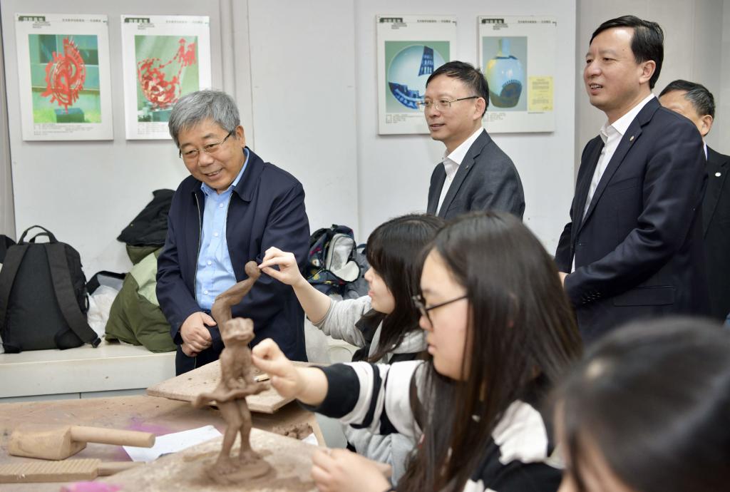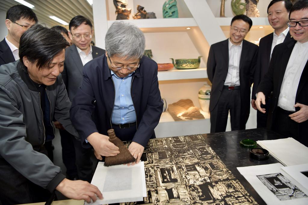 随后,陈宝生一行来到建筑与城市规划学院国家级实验教学示范中心艺术教学创新实践基地,现场观摩了大学生陶艺课教学,并亲身体验了木刻版画的印制。该基地既面向全校开设艺术通识课程,也面向学院各专业学生开设艺术课程,包括陶艺设计、扎染艺术、绘瓷艺术、琉璃造型、编织造型、纸雕造型等系列艺术课程。