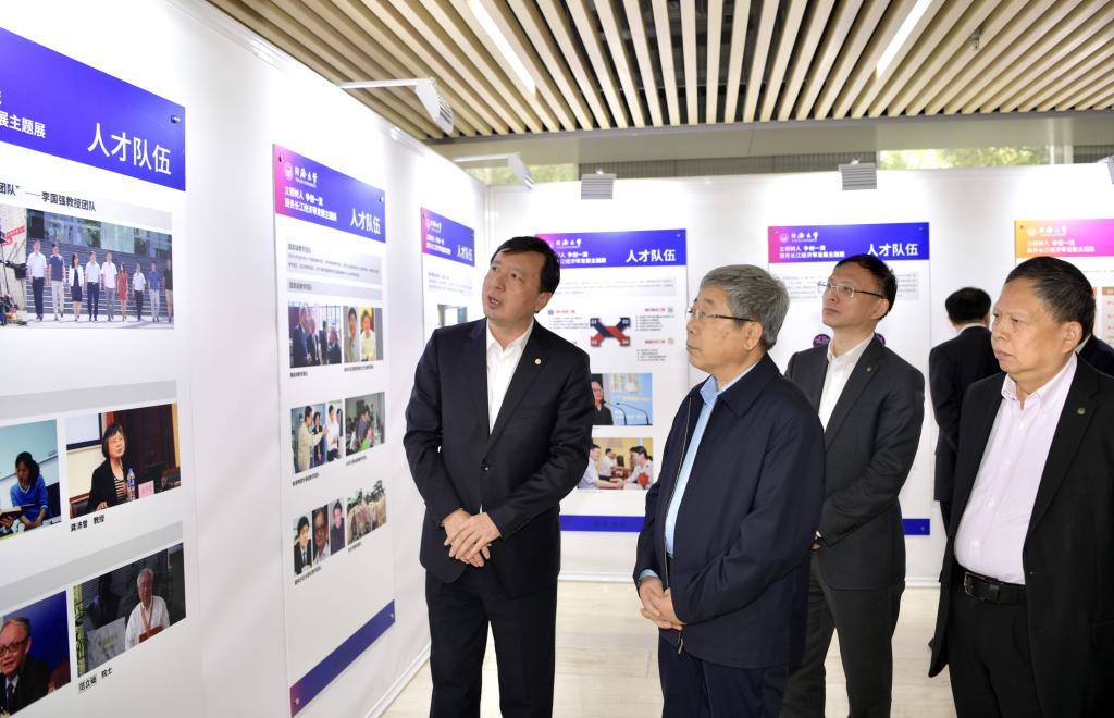 陈宝生一行首先来到衷和楼大厅,观看了“立德树人 争创一流 服务长江经济带发展主题展”,参观了我校师生部分科创成果。我校围绕服务国家重大战略和区域发展需求,与长江经济带多个省市签署合作协议,主动参与长江经济带建设,布局重大科研项目。近年来,围绕服务长江经济带建设的项目超过200项,涵盖土木、交通、建筑、规划、环保、汽车、海洋等诸多领域。
