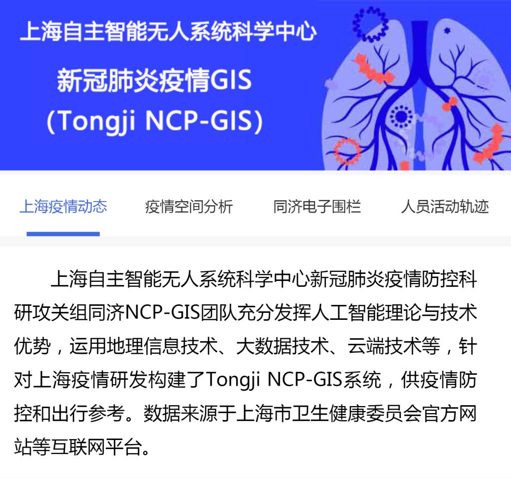 与这套疫情防控智能识别系统一同研发的,还有上海自主智能无人系统科学中心新冠肺炎疫情防控科研攻关NCP-GIS团队研发的新冠肺炎疫情地理信息系统(Tongji NCP-GIS)。团队充分发挥人工智能理论与技术优势,运用地理信息技术、大数据技术、云端技术等,针对疫情研发构建了新冠肺炎疫情地理信息系统,初步实现了上海疫情动态分析可视化、空间影响评估、数据空间分析、人员活动轨迹示踪等功能,为疫情防控预警和校园防疫决策分析提供空间信息辅助和支撑。