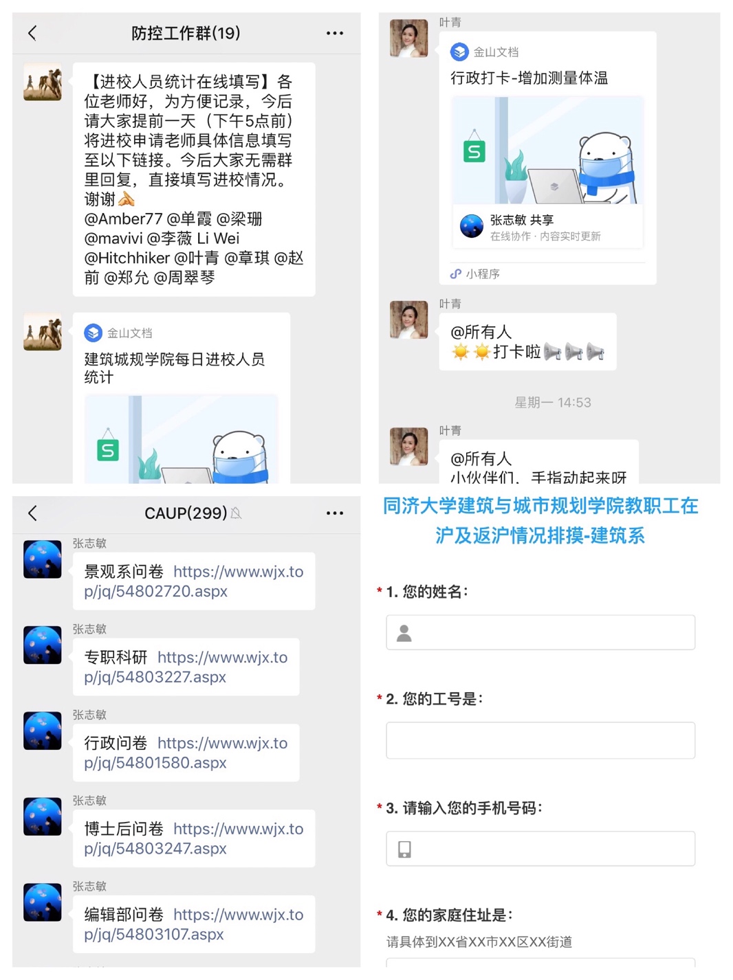 工欲善其事,必先利其器。学院疫情防控工作组利用微信工作群进行了充分地动员,如在学院教职工各类微信群中发布学校学院重要通知,并组建了“学校公寓教师群”,将学院所有入住学校教师公寓的教职工纳入此微信群,定点发布学校有关通知和规定,切实落实到位。结合实际工作情况,在不断梳理工作方式的过程中,学院又发掘了多种便捷统计方法,如利用问卷星征集教职工数据信息,利用金山云文档统计坚持每日打卡等,充分提升工作效率。对于学院个别不使用智能手机和微信的老教师,各位联络员分别一对一进行电话、短信联系,确保所有教职工知悉疫情防控的各项规定和进展。