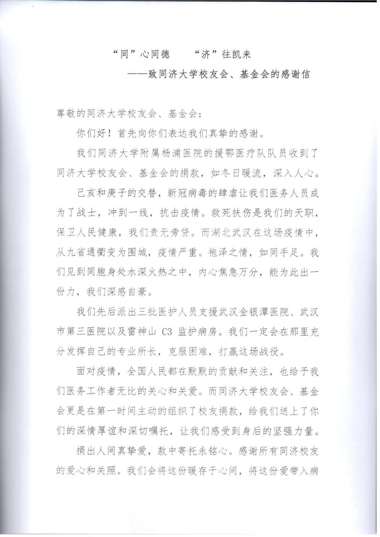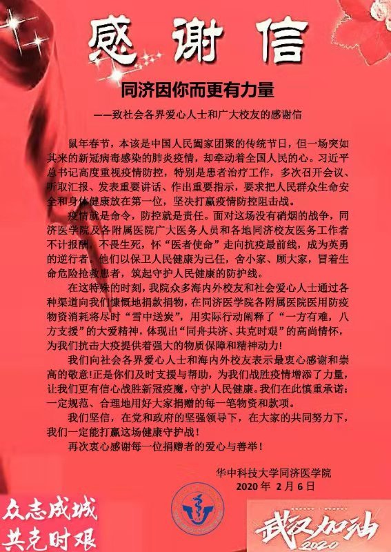 同济大学校友会、同济大学教育发展基金会表示,面对当前的疫情和人民的疾苦,相信同舟共济、守望相助、众志成城的强大力量可以为疫区提供物资支持和精神鼓舞。感谢所有关心和支持抗疫事业的海内外同济人及爱心人士奉献爱心,祈愿祖国大地早日迎来明媚的春天!(同济大学校友会、同济大学教育发展基金会)