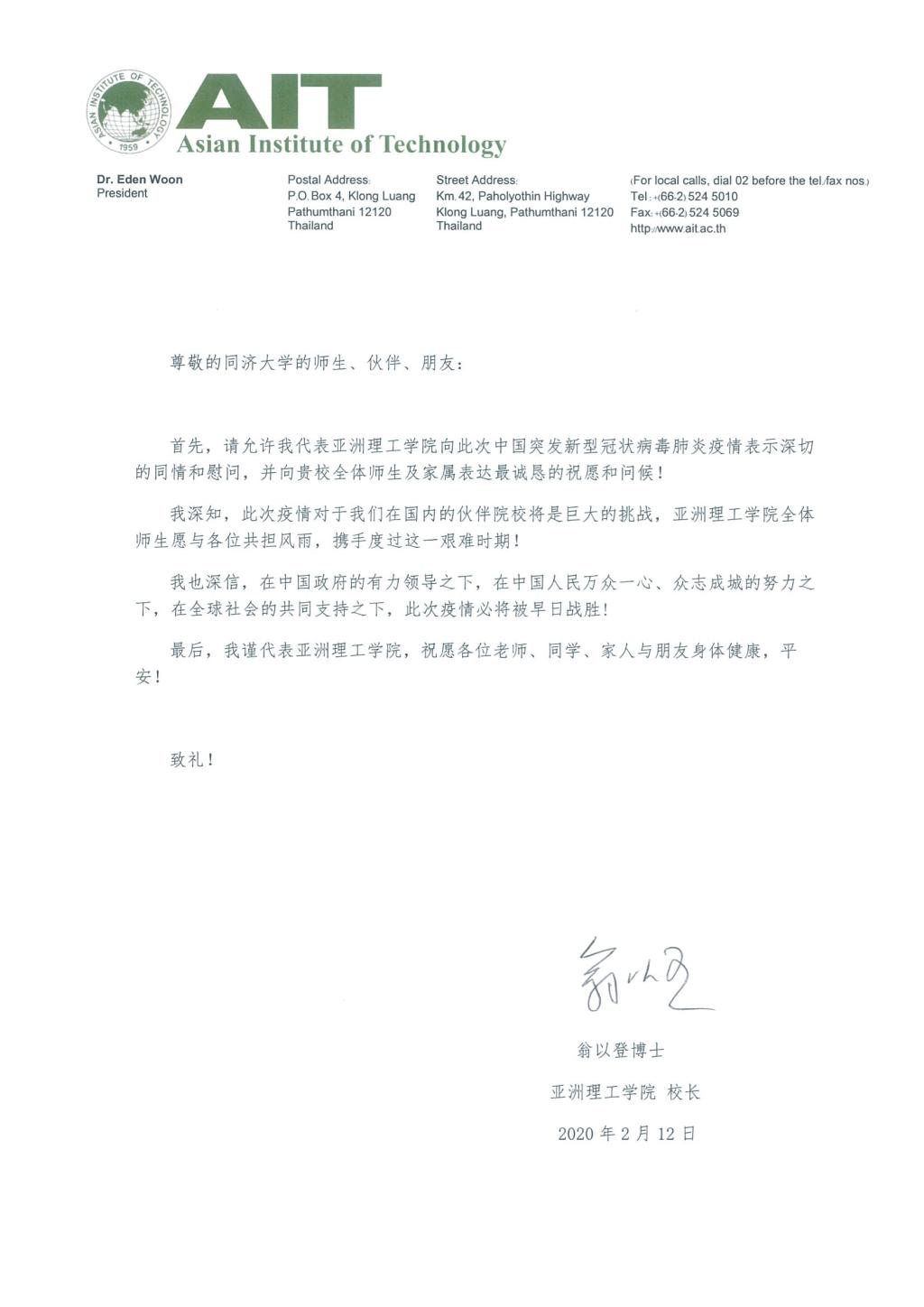 泰国亚洲理工学院校长翁以登表示,我深知此次疫情对于我们在国内的伙伴院校是巨大的挑战,亚洲理工学院全体师生愿与各位共担风雨,携手度过这一艰难时期。我也相信,在中国政府的有力领导之下,在中国人民万众一心、众志成城的努力之下,在全球社会的共同支持之下,此次疫情必将被早日战胜。