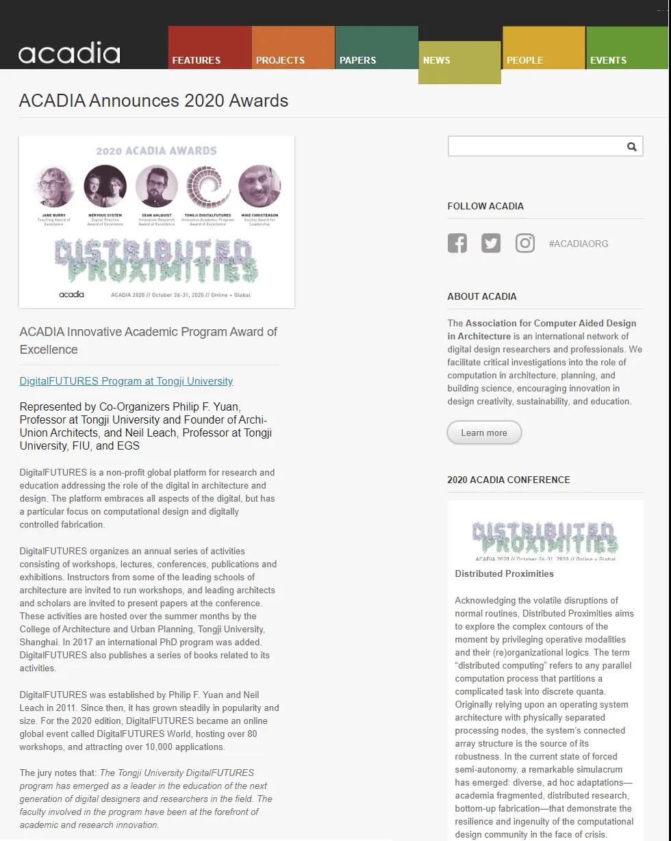6月11日,国际建筑计算机辅助设计协会(ACADIA)发布了本年度的系列学术奖项。由同济大学建筑与城市规划学院与上海数字建造工程技术中心主办、上海高校高峰高原学科建设计划同济大学建筑与城市规划学院数字设计与建造团队袁烽教授与Neil Leach客座教授共同主持的“DigitalFUTURES数字未来工作营”,被评选为“2020ACADIA Innovative Academic Program Award of Excellence(2020ACADIA创新学术大奖)”。
