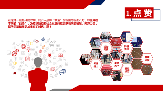 “疫情面前,我们首先要给我们的祖国点赞!给中国人民点赞!我还要给同学们、给我们同济人点赞!”上课一开始,方守恩分别点赞以医者仁心扛重任的“逆行天使”、不辱使命争朝夕的“基建狂魔”、挺立潮头勇争先的“科研先锋”、扎根基层践初心的“基层模范”、共克时艰献青春的“拳拳赤子” 以及笔耕不辍述情怀的“云端战士”。他说,在这样一段特殊的时期,同济人虽然“散落”在祖国的四面八方,却坚守在不同的“战场”,为疫情防控和社会发展持续贡献着同济智慧、同济力量,彰显了同济人的家国情怀。希望毕业学子能够带着这种情怀,踏上新的征程!