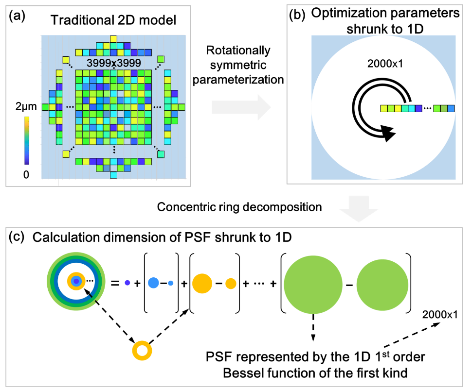 为了衍射光学元件与计算成像高效结合,实现轻薄高性能成像系统,将衍射光学元件和图像处理算法端到端协同设计必不可少。但目前还无法实现端到端协同设计实用化尺寸的衍射光学元件。主要原因在于端到端设计框架内存资源消耗极大,例如设计31个波长,口径8mm的DOE,其内存需求高达20GB,远超目前商用GPU显存大小。针对该核心问题,同济大学精密光学工程研究所博士后研究人员顿雄,提出了基于同心圆环分解的成像模型计算降维理念,并进一步结合能量正则化,成功地将端到端设计框架的内存需求降低了一个数量级。这使得研究团队首次实现了端到端设计8mm口径、31个消色差波长的衍射光学元件。实际成像效果验证了其优异的成像性能。镜头有效微结构厚度仅2微米,其实际厚度仅取决于结构所采用基底厚度,理论上可以薄至数百微米。该设计方法为基于衍射光学元件的轻薄计算成像系统发展铺平了道路,有望将轻量化便携式计算摄影引入全新时代。