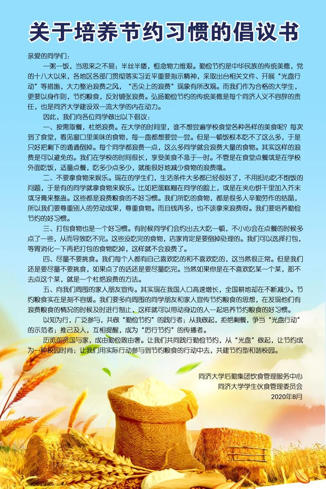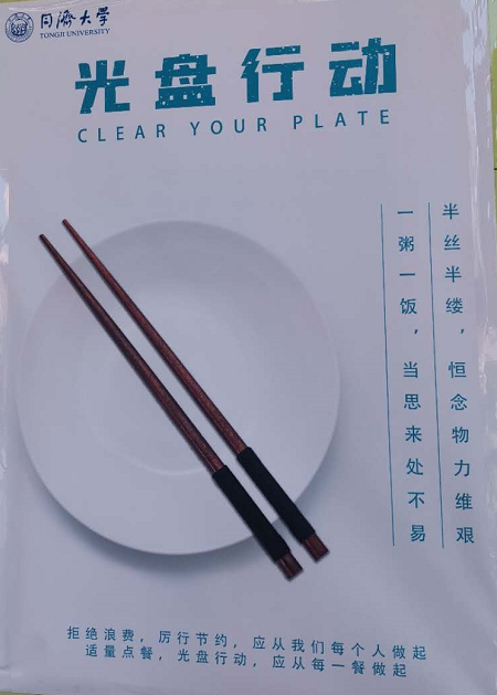 传播节约理念,加强宣传教育。“一粥一饭,当思来之不易;半丝半缕,恒念物力维艰。弘扬勤俭节约的传统美德是每个同济人义不容辞的责任。”在发出《倡议书》的同时,后勤集团还联合学校宣传部、校团委等部门,设计光盘海报及标签,在食堂各处进行张贴宣传。勉励同济学子以知为行,广泛参与,共做“勤俭节约”的践行者;从我做起,拒绝剩餐,争当“光盘行动”的示范者;推己及人,互相提醒,成为“厉行节约”的传播者。