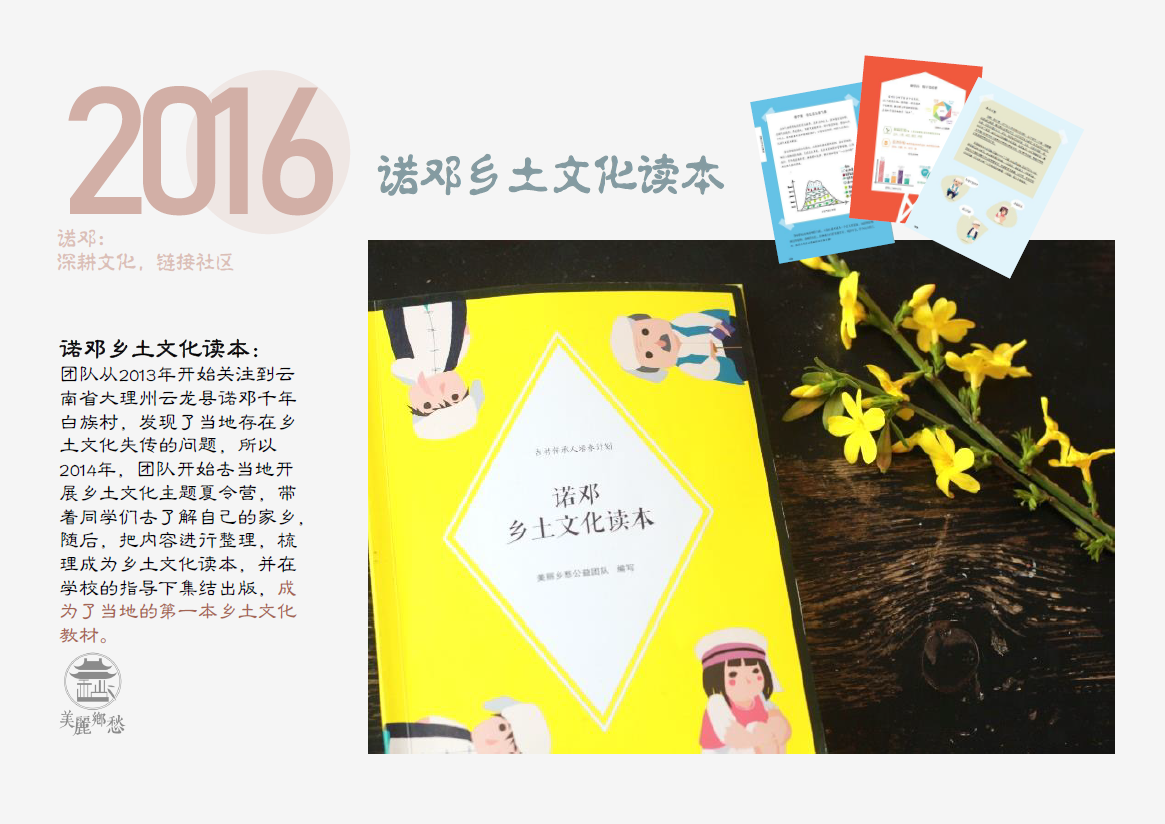 “方志”是地方文化讲述传承的代名词。在乡土文化流逝的今天,团队希望通过“家园一方志”计划,引导“在地青少年”与“返乡青年”这两个关键群体记录家乡文化、讲述家乡故事,产出一系列创意地方刊物、乡土文化读本,为未来乡村培养一批“知乡、爱乡、建乡、守乡”的接班人和建设者。在这样的理念与思路下,2013年,美丽乡愁乡土教育在诺邓起航;2014年,首个诺邓乡土文化夏令营“我的故事我的家”开幕;2016年9月,《诺邓乡土文化读本》出版;2017年1月,带着读本看家乡——“我的历史我的家”冬令营开启。