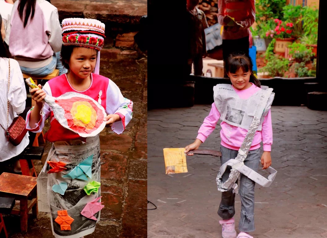 在别出心裁的诺邓职人T台秀中,古村儿童用废弃材料自制服装与劳动工具,展现着诺邓银匠、火腿师傅、老中医等手艺人的职业风采。