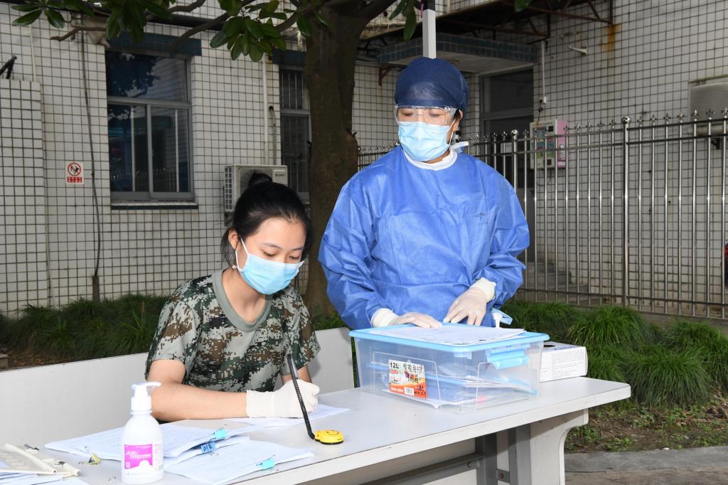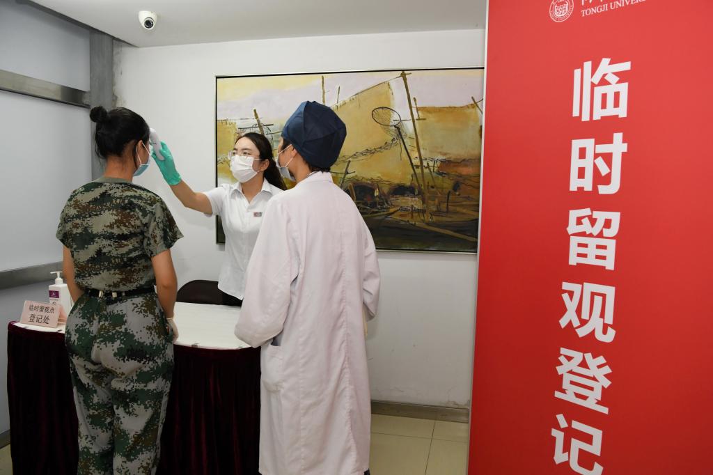 随后,在校医院门口,这名学生首先填写《健康状况信息登记表》,医护人员对学生进行流行病学调查,问询了解学生健康状况相关信息,决定对该学生作留观处置。学生在《同济大学临时留观承诺书》上签字,承诺在留观期间将严格遵守学校的各项规定和要求,并认真阅读《同济大学临时留观注意事项告知书》。