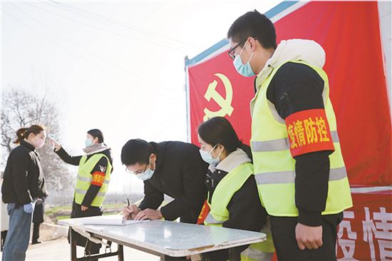 马明杰(右一)等志愿者在村口防控检测点执勤。