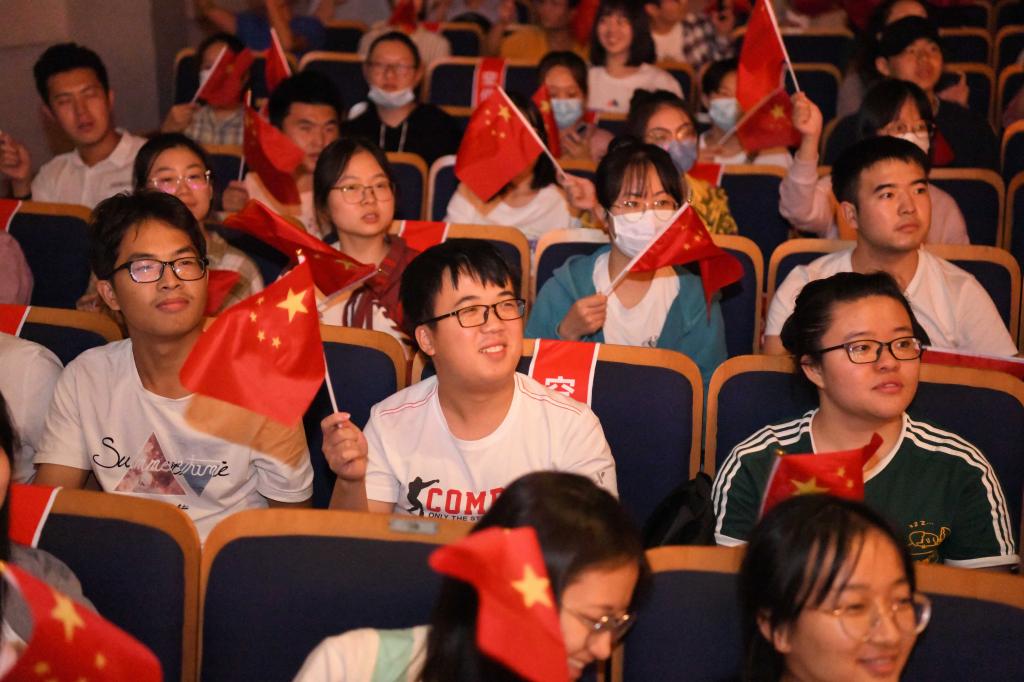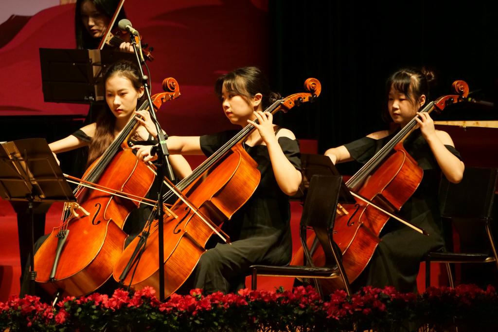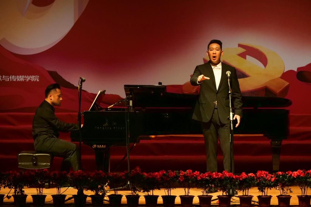 “不忘初心,继续前进。万水千山,最美中国道路。”“青春中国,中国青春,人类世界有我们东方的赞歌,东方的赞歌。”作为音乐会的压轴节目,学校1907室内合唱团表演了合唱《不忘初心》《青春中国》,教师朱洋担任指挥。最后,全场师生挥舞手中的国旗,齐声唱响一曲《歌唱祖国》。