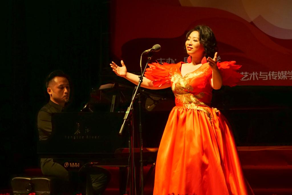 这场国庆主题音乐会由我校艺术与传媒学院师生担纲演出。音乐会一开场,同济大学学生弦乐团带来了一曲深情款款的弦乐合奏《我和我的祖国》,教师陈佳担任指挥。随后,艺术与传媒学院本科生王宝鹏的男声独唱《沁园春·雪》《我的祖国妈妈》,教师齐琳的小提琴独奏《丰碑》,本科生李辉雪的钢琴独奏《百鸟朝凤》,教师王伊达的女声独唱《我爱这土地》《映山红》,本科生侯欣聆的长笛独奏,教师沈婷的小提琴独奏,李辉雪、教师齐欢的双钢琴演奏,齐欢、隋歆、王夕岚、张弛四位教师的双钢琴八手联弹《保卫黄河》先后献演,其乐声、歌声或激昂豪迈,或舒缓柔情,或欢快奔放,奏、唱出了对祖国的赤诚之爱,将音乐会气氛不断推向高潮。台下师生凝神屏息静听,陶醉其中,会场不时响起一阵阵热烈掌声和喝彩声。