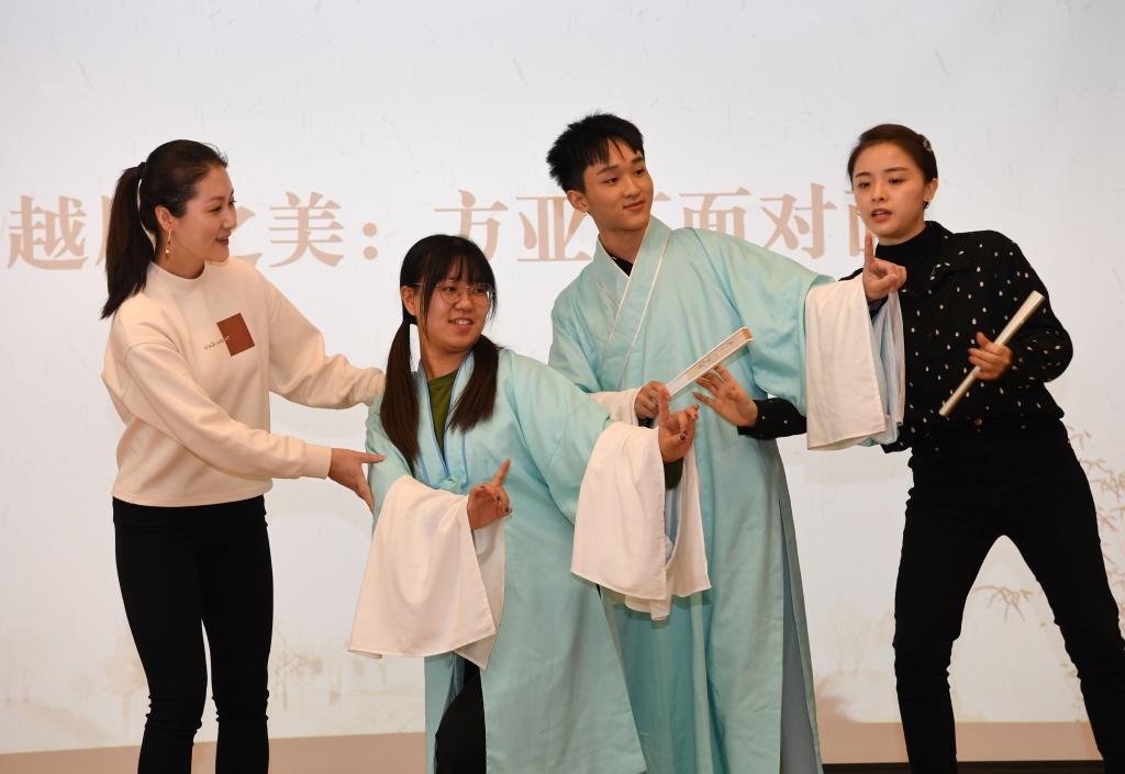 国家一级演员、著名越剧表演艺术家方亚芬与同济师生面对面,畅谈“越剧之美”。她简要介绍了越剧百余年的发展历程以及越剧四大经典剧目,献唱了越剧《西厢记·琴心》经典选段,带领师生领略越剧艺术之美。3位青年越剧演员表演了越剧《红楼梦》《祥林嫂》选段。方亚芬还对我校越剧社学生赵艺茗、韦赛蕾的唱段表演进行指导。学生还体验了台步、水袖、手势等越剧形体语言之魅力。