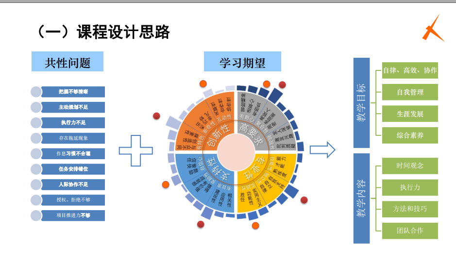 交通运输工程学院党委副书记邹晓磊分享了通识类综合素养课《时间管理》的教学设计思路,现场进行了“时间管理的核心理念”知识点的教学展示。在调研学生共性问题、分析学生学习期望的基础上,教学团队确定了教学目标和课程内容,通过课程内容优化与教学设计,帮助学生树立科学的时间观、提高可靠的执行力、掌握有效的管理技能、提升团体工作成效。