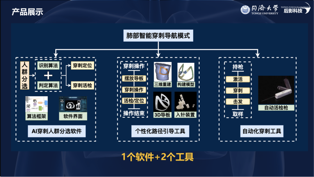 汪洋主持的项目“后影科技——肺部穿刺智能导航模式开拓者”获银奖。团队充分挖掘患者诊断性CT中的影像数据,通过对患者胸廓进行计算机建模,个体化设计并打印能够引导穿刺进行的3D导板。该产品可以避免操作时的反复调试和辐射伤害,降低穿刺相关并发症的发生,能根据患者的体表标志(锁骨、胸骨等)规定穿刺点位置、穿刺角度和穿刺深度,旨在引导穿刺针精准定位靶点,使操作者无需技术培训、无需CT引导即可快速、精准地完成穿刺操作。