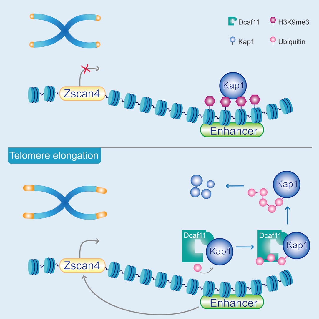 研究人员进一步研究Dcaf11促进端粒延长机制发现,Dcaf11作为E3泛素连接酶(是一个能够将泛素分子连接到目的蛋白质的某个赖氨酸上的酶)的识别蛋白,靶向底物Kap1(转录调控中的一个桥梁分子)并促进其降解。在Dcaf11敲除的ESC(胚胎干细胞)中,敲降Kap1后可重新激活Zscan4,进而修复Dcaf11缺失而引发的端粒缺陷,激活端粒延伸机制。