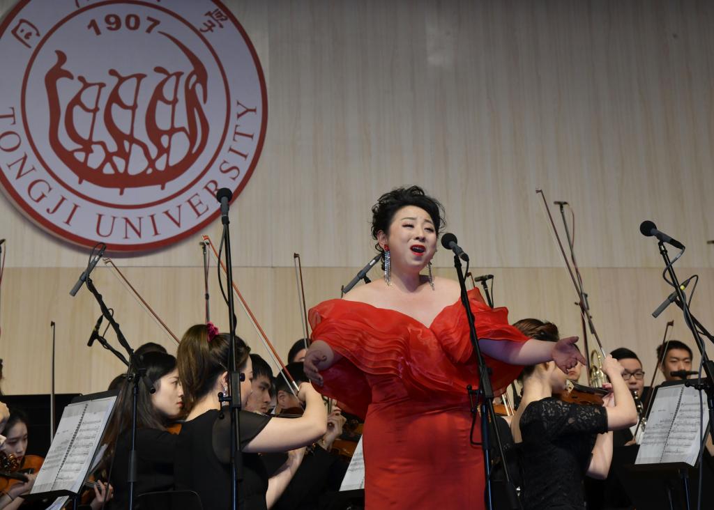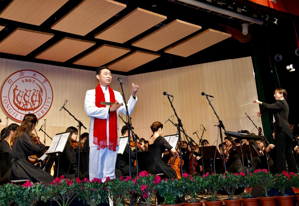 音乐会在一曲欢快的管弦乐合奏《卡门》序曲中拉开帷幕。随后,外聘教师庄媛的钢琴独奏《C大调第一钢琴协奏曲》第三乐章,教师王伊达的女声独唱《漫步街上》《绒花》,管弦乐合奏《蓝色多瑙河圆舞曲》和《艾格蒙特》序曲,声乐教授李巍的男声独唱《把一切献给党》《登山缆车》,京剧表演艺术家梅葆玖先生入室弟子、附属同济医院副主任医师李健的男声独唱京歌《梨花颂》,先后献演,或激越高亢,或舒缓柔婉,各具艺术魅力和感染力,奏、唱出了同济人对党、对祖国的赤诚之爱和报国之志。台下师生凝神屏息静听,陶醉其中,每当一曲终了,掌声四起。