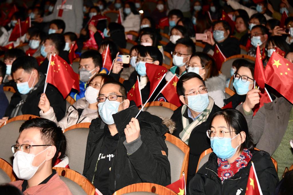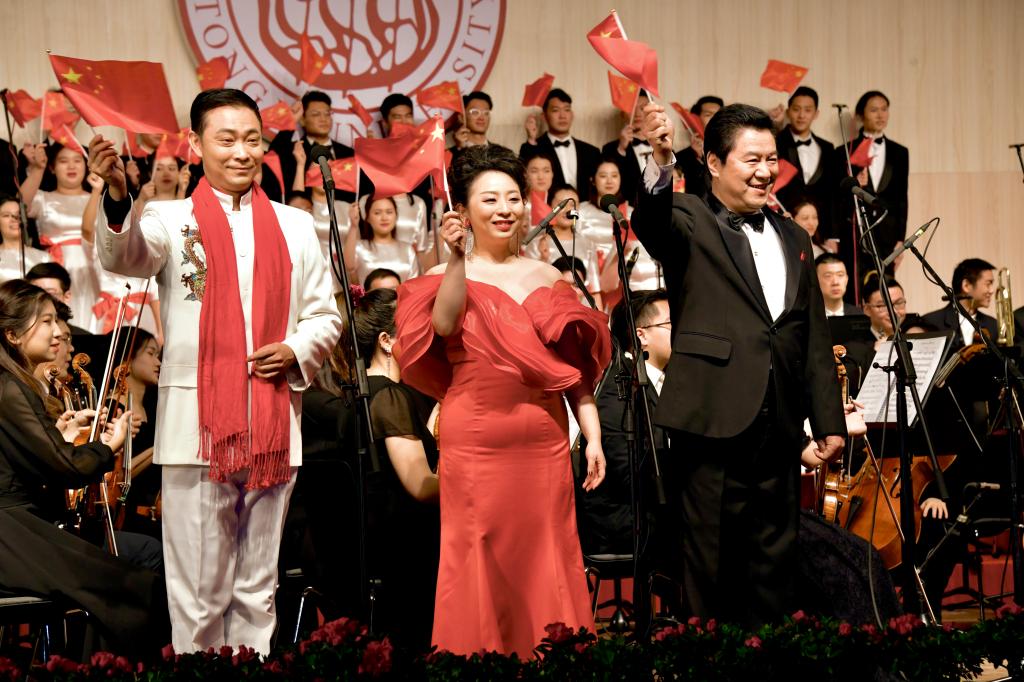 “青春中国,中国青春,人类世界有我们东方的赞歌。”作为新年音乐会的压轴节目,李巍、李健、王伊达带领1907室内合唱团,深情放歌同济大学原创歌曲《青春中国》,以及经典之作《我的祖国》。伴随着《我的祖国》熟悉的旋律,全体演员、听众共同挥舞手中的小国旗,齐声高歌,礼赞、祝福伟大祖国。