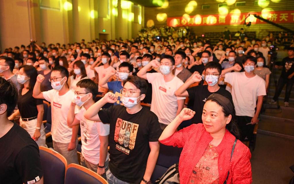 演出最后,在2020年“全国优秀共青团员”、2019年上海市青年五四奖章获得者、土木工程学院2018级博士研究生张文津带领下,全场师生党员起立,面对鲜艳的党旗,庄重地举起右手,共同重温了入党誓词。铿锵有力的誓言,响彻礼堂。