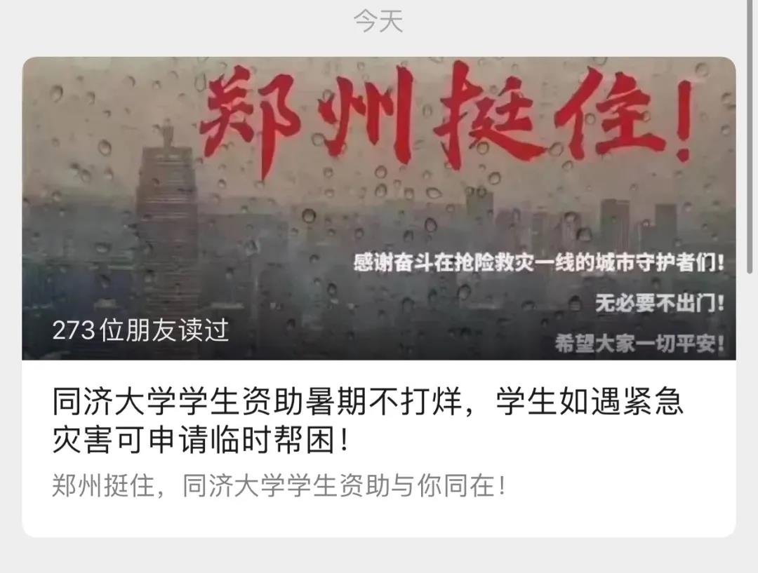 当日上午,同济大学学生事务中心微信公众号发出了一篇题为《同济大学学生资助暑期不打烊,学生如遇紧急灾害可申请临时帮困!》的推文(https://mp.weixin.qq.com/s/lOJq69KO9Mej-gtIMbVSOw)。同济大学动员部署各学院紧急摸排河南籍学生及在河南的同济学生家庭受灾情况,表示有需求的学生可向学校申请最高5000元的临时帮困补助,做到“全力排查,发现一例,报送一例,资助一例”。学校将充分利用学校资助政策,切实保障学生安心学习生活,启动临时帮困发放快速通道,与财务处协同,尽快将资助金发放到学生手中。
