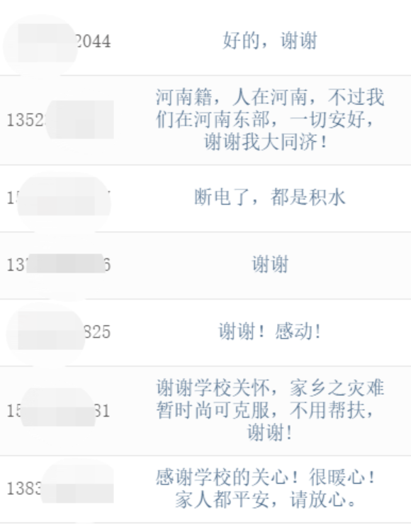 学生事务中心与信息化办公室联手,面向河南籍及在河南的1903名同济学生发布短信提醒,宣传学校资助政策,提醒有需求的学生及时与学校联系,号召同学们以实际行动贯彻落实习近平总书记关于防汛救灾工作的重要指示精神,同舟共济、众志成城,积极配合当地政府防汛救灾工作,并做好个人防护。“感谢学校的关心,很暖心!家人都平安,请放心。”“谢谢学校关怀,家乡之灾暂时尚可克服,不用帮扶。”“感谢学校的关心和爱护,我们这里目前平安。”……同学们纷纷回复短信,报送平安。