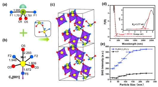 非线性光学晶体材料是应用激光频率转换技术实现激光器光源向未开发波段扩展的关键性元件,其中中红外(3-5 μm)激光材料在激光医疗、军事通讯、半导体光刻等众多先进激光技术领域具有重要的科学价值和广阔的应用前景。目前,硫族化合物AgGaS2、AgGaSe2和ZnGeP2作为商业化的中红外非线性光学晶体具有优越的倍频效应和红外透射范围,但普遍存在着带隙窄、激光损伤阈值低和双光子吸收等缺点,严重限制了它们在高端激光技术中的实际应用。而基于孤对电子氧阴离子的金属氧化物往往表现出较大的激光损伤阈值和良好的晶体生长习性,却无法同时满足强倍频效应(>10 × KDP)和宽光学带隙(>3.5 eV)两个相互矛盾的固有结构性要求,因此如何获得倍频效应和光学带隙同步显著优化增益的氧化物晶态材料是当前中红外非线性光学材料研究中一个极具挑战的科学难题。