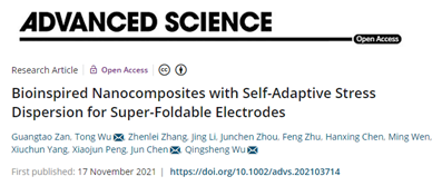 此外,吴彤团队近期还与美国加利福尼亚大学洛杉矶分校(UCLA)陈俊等专家合作在超折叠电极上取得了突破性进展,相关成果“Bioinspired Nanocomposites with Self-Adaptive Stress Dispersion for Super-Foldable Electrodes”近期在线发表在综合性国际权威期刊《尖端科学》(Advanced Science, 2021, DOI: 10.1002/advs.202103714)上。