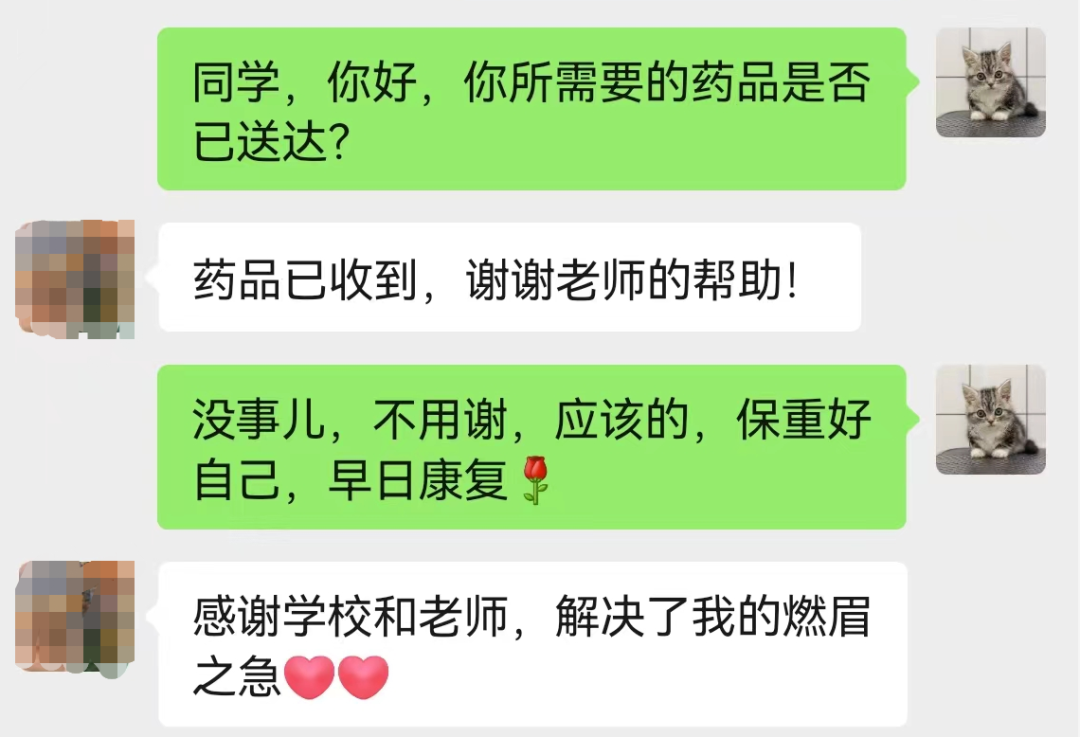 “药品已收到,谢谢老师的帮助!”……近日,学校就医用药工作小组频频收到学生和家长的致谢信息。封控不封心,隔离不隔爱,这感谢的背后是学校一次次全力保障学生就医用药的“爱心接力”,为生命护航。