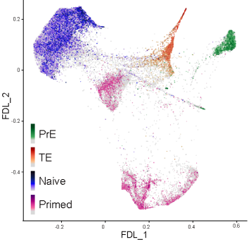 与传统的primed(人类多能干细胞可分为 naive和 primed两种状态)多能干细胞相比,人naïve多能干细胞捕获了体内胚胎植入前的发育特征,具有更高的可塑性和更好的分化潜能,为早期胚胎发育研究及临床应用提供了独特的模型和资源。然而,目前对于naïve态建立过程中发生的关键分子生物学事件了解有限,对于细胞从primed态多能性诱导成naïve态多能性过程中 (primed-to-naïve) 的细胞亚群变化及关键分子事件仍不清楚。