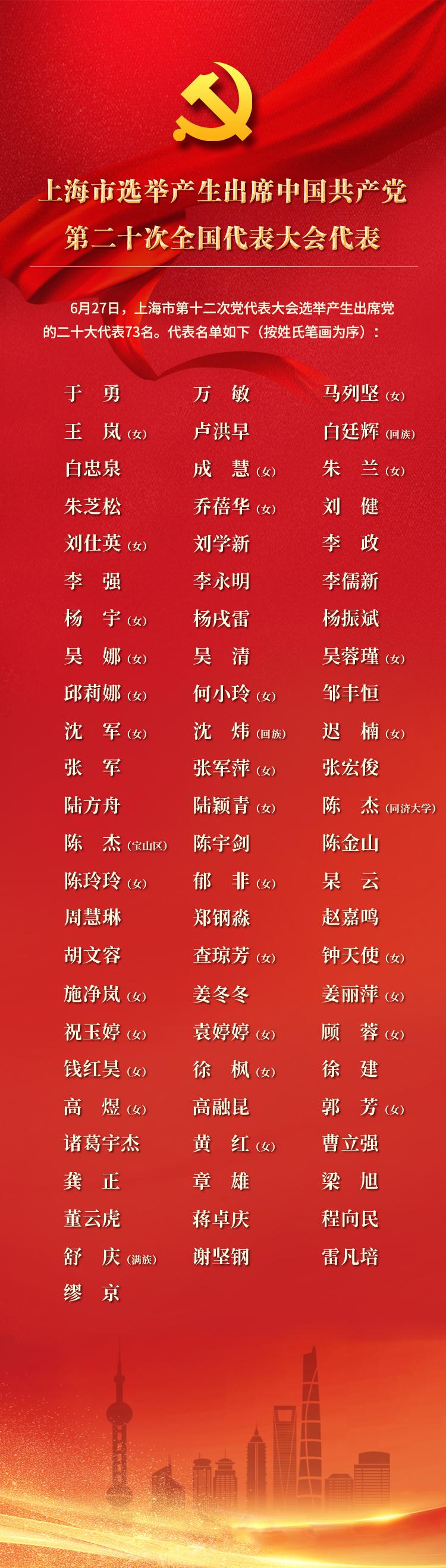 据上海发布7月14日报道,6月27日,上海市第十二次党代表大会选举产生出席党的二十大代表73名,同济大学校长陈杰当选。
