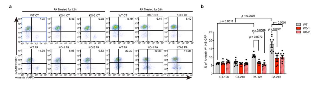 该研究发现,ZnT8缺失的SC-β细胞在经棕榈酸等脂毒性诱导物处理后凋亡细胞数量显著少于经相同处理的对照组,这意味着ZnT8缺失的β细胞可以更好得抵抗高脂引起的代谢压力。进一步分析发现,ZnT8缺失的SC-β细胞在一定浓度的棕榈酸的刺激下并未表现出与对照组相同的以IRE1α、sXBP1为代表的内质网应激标志物显著升高的现象,胞质内钙离子水平与线粒体去极化水平也显著低于对照组。上述结果表明ZnT8缺失可以抵抗脂毒性对SC-β细胞造成的内质网应激压力,从而减少细胞凋亡。