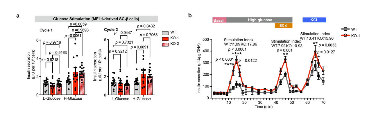 葡萄糖刺激胰岛素分泌(Glucose stimulated insulin secretion, GSIS)实验是测试SC-β细胞功能的最佳标准,细胞在高糖刺激下的胰岛素分泌量与低糖刺激下胰岛素分泌量相比的倍数可直接反映β细胞响应糖刺激的能力,倍数越高,能力越强。研究人员为了验证上述结果,在3个独立的ZnT8敲除的细胞系中做了GSIS实验,发现在两轮低糖-高糖刺激下ZnT8缺失的SC-β细胞相较于野生型SC-β细胞均表现出显著的胰岛素分泌能力增强的表型。研究人员通过进一步探索发现,ZnT8缺失的SC-β细胞旺盛的胰岛素分泌能力可能与其解除了锌离子对胰岛素分泌的负反馈抑制相关。