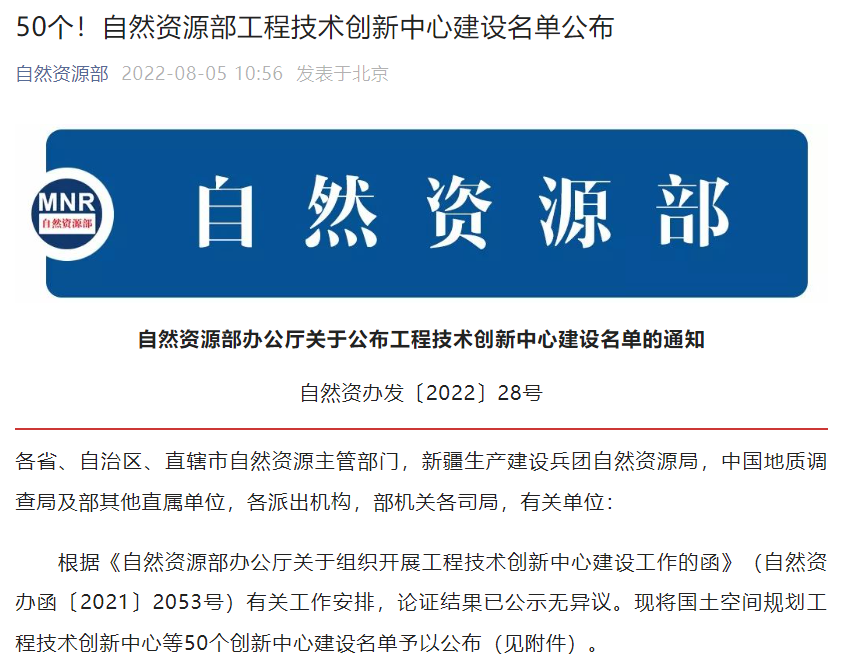 自然资源部组织开展工程技术创新中心建设工作,旨在进一步提升自然资源自主创新与成果转移转化能力,推动实现高水平科技自立自强。