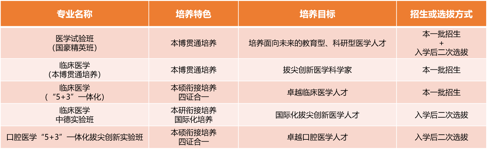 另外,在学校拔尖人才培养特区中设置了本研衔接的临床医学中德实验班,探索国际化拔尖创新医学人才的培养。在特区中还设置口腔医学“5+3”一体化拔尖创新实验班,培养引领未来的卓越口腔医学人才。详见下表: