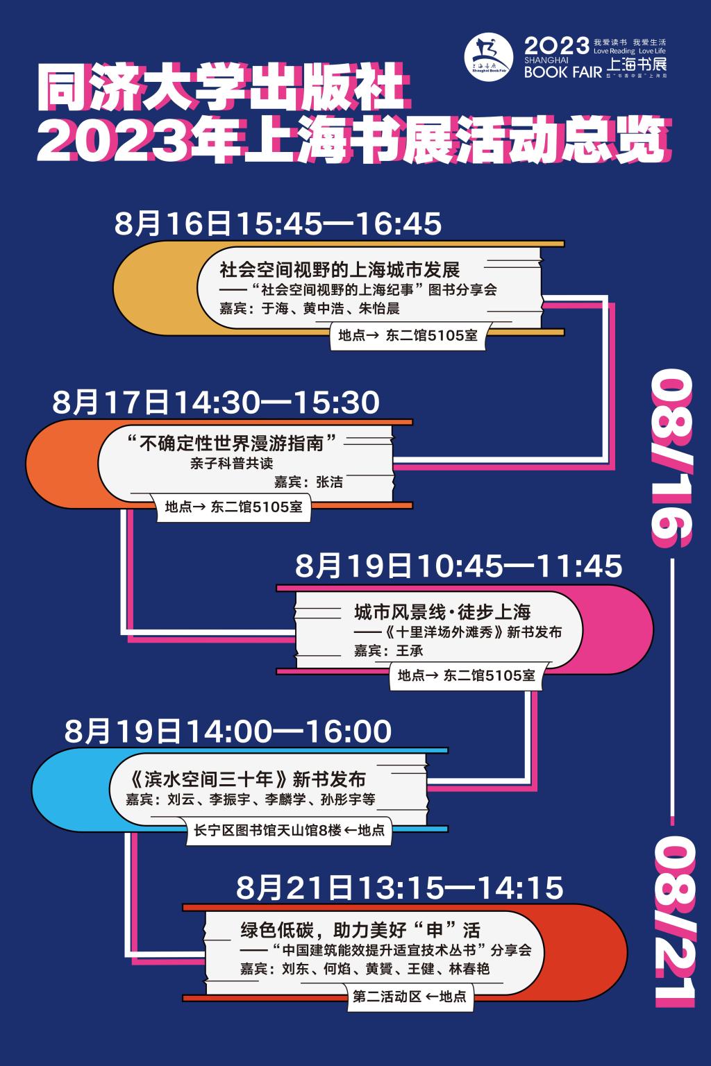 2023上海书展暨“书香中国”上海周定于8月16日至22日在上海展览中心举办。同济大学出版社精选近700种图书与广大读者见面,同时准备了多场重磅特色活动。