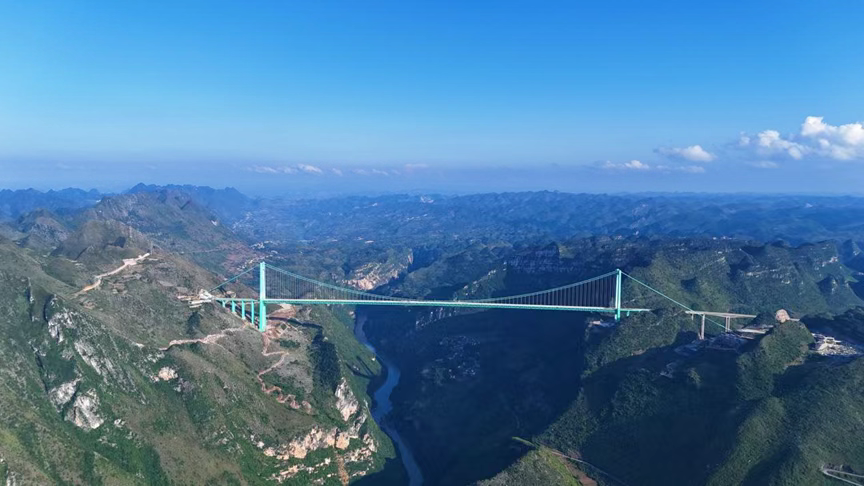 花江峡谷大桥巍然屹立于被誉为“地球裂缝”的花江大峡谷之上,大桥全长2890米,主桥跨径1420米,居山区桥梁世界第一;其桥面距水面高差625米,同样登顶世界第一。大桥在索塔、锚碇设计,抗风设计,高空施工等领域实现了多项技术突破,为全球山区桥梁建设提供了“中国方案”。