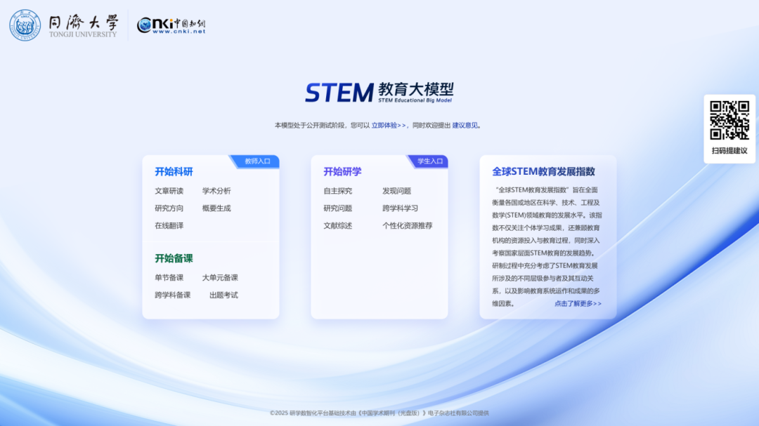 会上,同济大学—中国知网STEM教育大模型发布。该模型由同济大学与中国知网合作开发,将链接中国知网资源,构建STEM(科学、技术、工程和数学)教育智能服务,推动“教育+AI”在STEM教育场景应用与深度耦合。