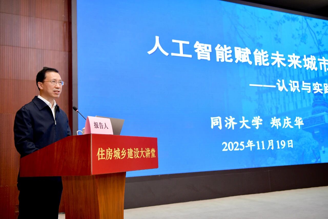 座谈交流前,郑庆华以《人工智能赋能未来城市——认识与实践》为题,为“住房城乡建设大讲堂”作专题讲座,阐述了人工智能引发的各领域深刻变革、人工智能技术发展路径,以及对城市高质量发展的思考,介绍了当前同济大学正全面推进“数智化、绿色化、融合化”转型创新发展,以人工智能赋能人才培养等学校各项事业发展的实践探索。