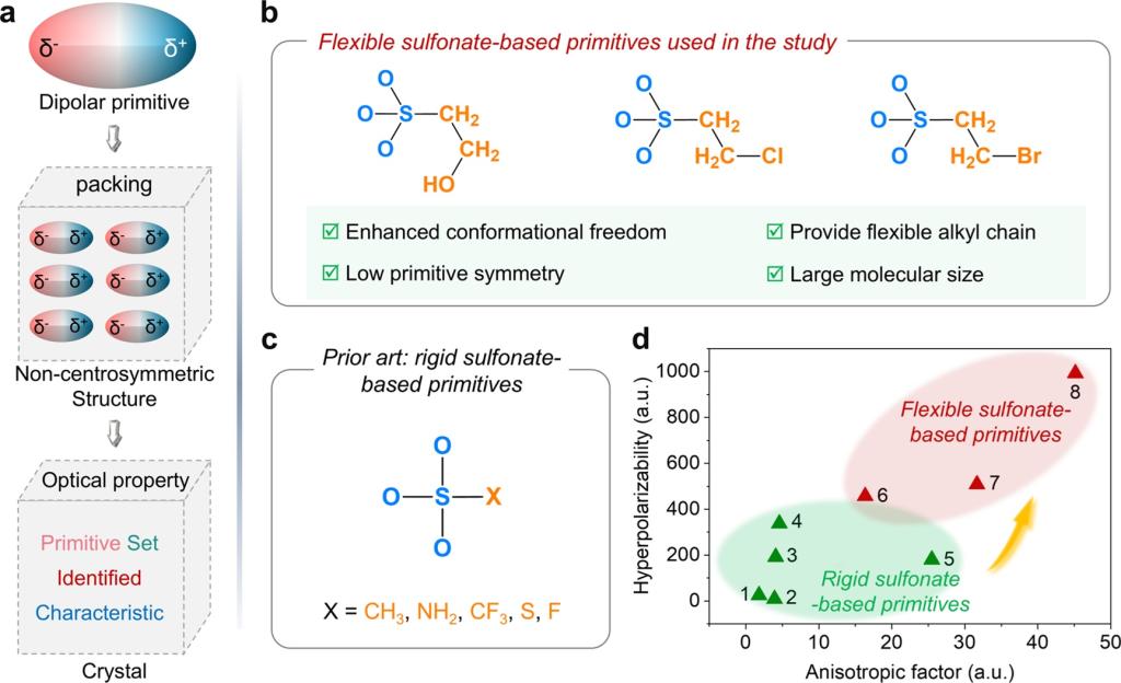 近日,欧洲科学院院士、德国国家工程院院士、同济大学化学科学与工程学院张弛教授研究团队,联合中国科学院北京理化技术研究所、澳大利亚国立大学等单位,在深紫外透明极性有机磺酸盐非线性光学晶体研究中取得重要进展。研究团队提出“连接性调控”策略,通过精准调控阴离子烷基链或抗衡阳离子,成功合成出系列高性能有机磺酸盐晶体,其中,Li [SO3(CH2)2OH]晶体成功实现了深紫外透明度与非线性光学性能的协同优化。相关成果“Unlocking Strong Second-Harmonic Generation in Deep-UV-Transparent Polar Organic Sulfonates through Connectivity Regulation” (通过连接性调控在深紫外透明极性有机磺酸盐中实现强二次谐波产生)日前以全文(Research Article)的形式发表于国际化学、材料权威学术期刊《德国应用化学》(Angewandte Chemie International Edition, 2025, e21786),并被编辑委员会遴选推荐为当期的封面文章和热点论文(HOT Paper)。