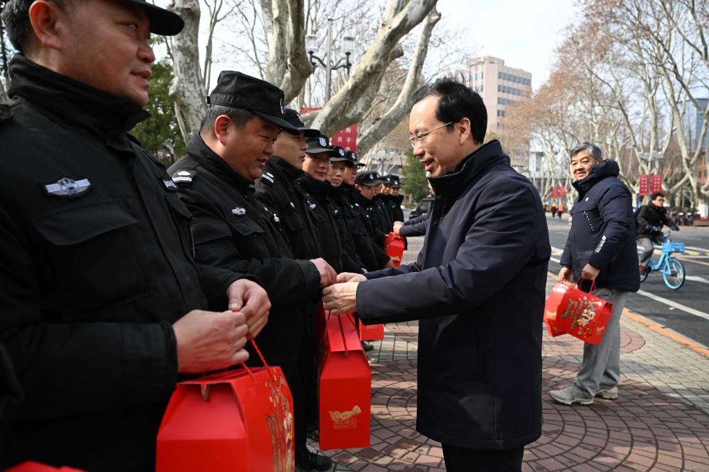 “大家辛苦了!提前给你们拜年!”新春将至,27日下午,校党委书记、中国工程院院士郑庆华深入校园一线,亲切看望慰问寒假春节期间仍坚守岗位的工作人员,感谢他们放弃与家人团聚的机会、留岗值班值守,并向他们致以诚挚的节日问候和美好的新春祝福。校党委副书记刘润等参加慰问。