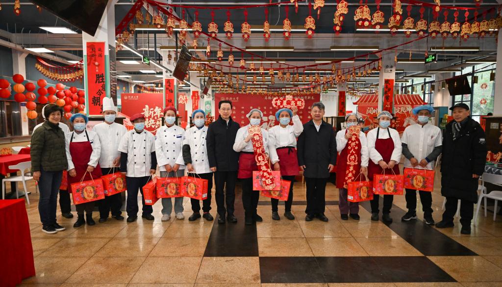 郑庆华先后来到四平路校区大门、学苑饮食广场、西南二楼学生社区(启迪书院)和校医院等处,分别向在岗的保卫人员、厨师、学生宿舍管理人员和医务人员等表示亲切慰问,向他们送上新年礼包和喜庆春联,感谢他们的辛勤付出和默默奉献,希望大家继续保持饱满的工作热情,恪尽职守,用心用情做好寒假春节期间学校各项服务保障工作,并祝愿他们在新的一年里身体健康、阖家幸福。