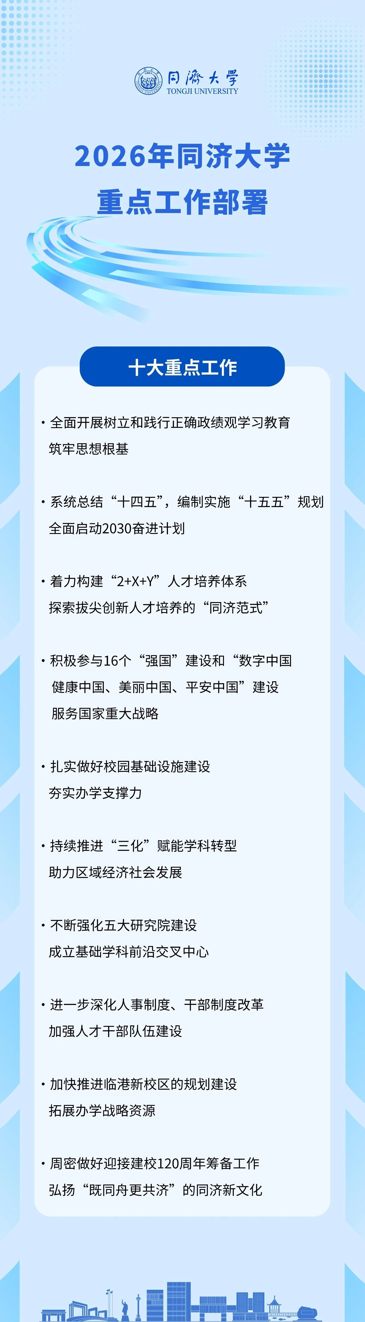 杨金龙指出,对接国家战略、服务地方经济、推动人类进步,是现代化大学的核心使命与价值导向。国家战略所指,就是同济奋斗所向。江河奔涌,唯奋楫者先;风浪激荡,唯同心者胜。2026年,学校将继续聚焦“强国建设,同济有为”,凝心聚力,进一步深化教育综合改革,坚持以一流党建引领一流大学建设,持续深耕学科交叉融合和工程智能赋能,强化有组织科研和有组织培养拔尖创新人才,在中德中欧教育科技人文交流和国家开放合作中展现更大作为,确保“十五五”开好局、起好步,以实干实绩迎接建校120周年,奋力谱写中国特色世界一流大学建设的崭新篇章。