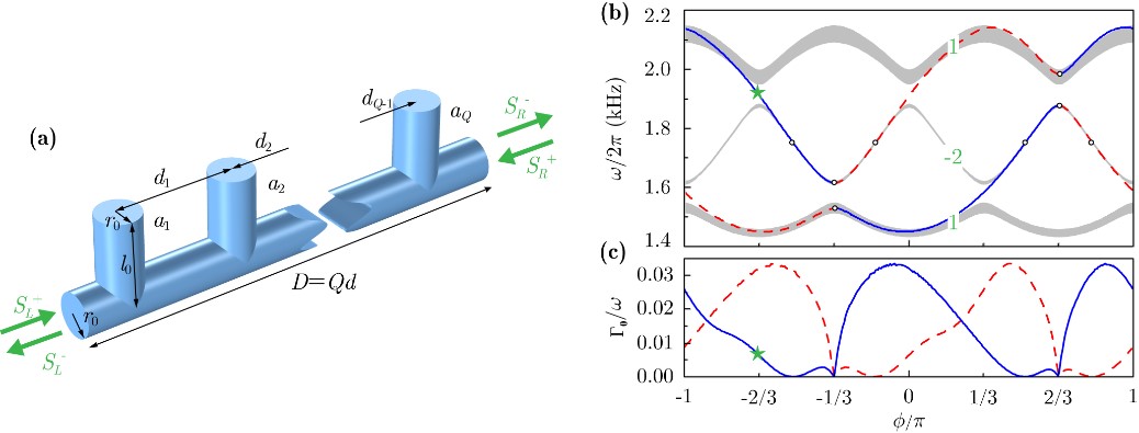 图1:(a) 类比Aubry-André-Harper模型的声学局域共振结构,局域共振单元之间的距离受余弦函数的调制。