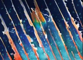 此图为横截面图,高衬度灰色部分为导向孔的横截面电镜图,低衬度白色部分为冻干的水凝胶。我们想到了以水为创作灵感对图片进行艺术化处理,使之呈现出深蓝的大海与层层海浪交替的视觉效果,同时以材料的孔进行颜色层次上的处理,营造一种海洋环境下别有他物的生动效果。最后将海浪附上鲜亮的色彩寓意这材料犹如这深邃的大海一般蕴藏着一个丰富多彩的世界,只要对其进行深入的价值探索便会激起如这浪花般的绚丽效果,体现该材料的无限可能和妙不可言的特性所在,故取名为“浪彩海洋”。
