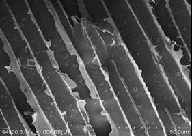 由于水泥基材料为不导电样品,同时为了观察其在均匀外力作用下自然断裂面的微观形貌,本图片为直径约1cm不进行任何处理的小试块进行微观形貌观察的结果。由于样品的不导电性以及表面形状的凹凸不平,给电镜拍摄带来相当大的难度。拍摄图像所采用条件:真空度:1.97e-004pa;电压:5KV;工作距离:3.0mm;放大倍数10K;所采集的信号为二次电子。拍摄图像如同一束生长在悬崖边的杂草。其实则为钙矾石。其能够导致水泥基材料性能的弱化和损失,也是水泥基构件在外力作用下,容易发生破坏的受力薄弱点。