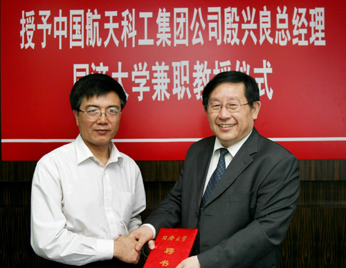 6月2日,中国航天科工集团殷兴良总经理一行4人应邀访问我校。万钢校长和杨东援副校长在逸夫楼贵宾室会见了客人,双方就进一步加强交流与合作进行了商谈。殷兴良总经理受聘为我校兼职教授。