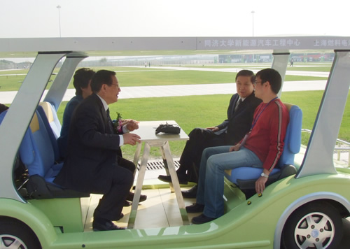 博览会开幕式结束之后,在校长万钢陪同下,科技部部长徐冠华等领导一行乘坐由我校与上汽共同研制的上海第一辆氢燃料电池客车,来到五号高校展区。紧接着,徐冠华、万钢等饶有兴趣地乘上由我校自主研发的春晖系列新款车——无人驾驶游览电动车,体验乘坐新感觉。