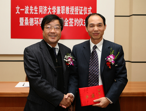 12月12日,学校举行了北京桑德环保集团董事长兼总裁文一波先生同济大学兼职教授授证仪式暨桑德环境教育奖励金签约仪式。赵建夫副校长授予文一波先生同济大学兼职教授证书,并为其佩戴同济大学校徽。环境学院周琪院长和文一波总裁进行桑德环境教育奖励金的签约。签约结束后,赵建夫副校长在讲话中对北京桑德环保集团对高校科研的大力支持表示感谢。